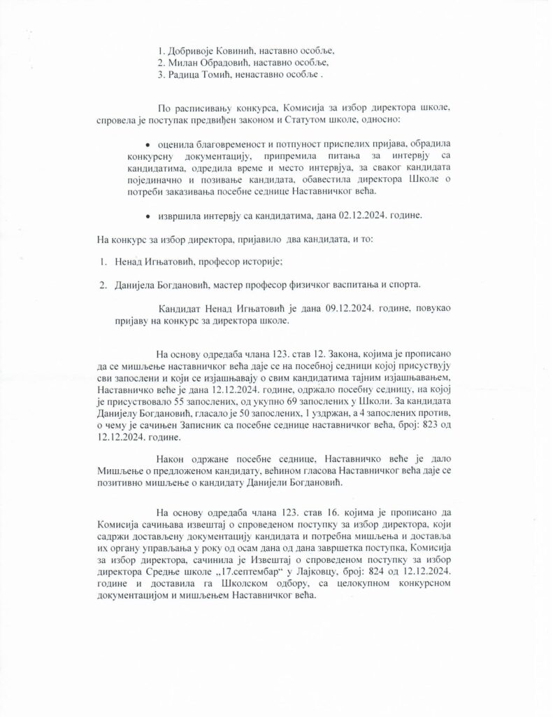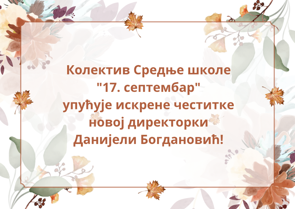 У име целокупног колектива Средње школе „17. септембар“ у Лајковцу, желимо да ти упутимо срдачне честитке поводом твог именовања на место директорке. Са великом радошћу и поносом прихватили смо ову вест и сигурни смо да ће твоје искуство, посвећеност и лидерске способности бити кључни за даљи развој наше школе.