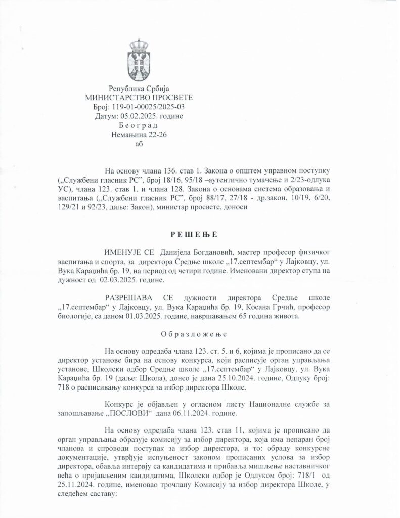Нова директорка Средње школе „17. септембар“ у Лајковцу, Данијела Богдановић, недавно је именована на ову одговорну позицију. Са значајним искуством у образовању, Данијела доноси свеж приступ и визију која ће осигурати да школа настави да напредује у свим аспектима.