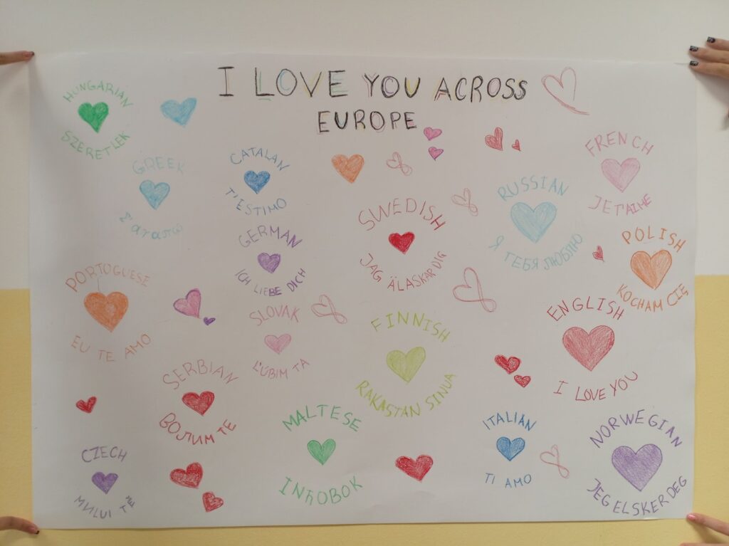 Љубав као покретач инспирисао је ђаке да уз илустрације на раличитим језицима напишу и науче да кажу ,,ВОЛИМ ТЕ“.