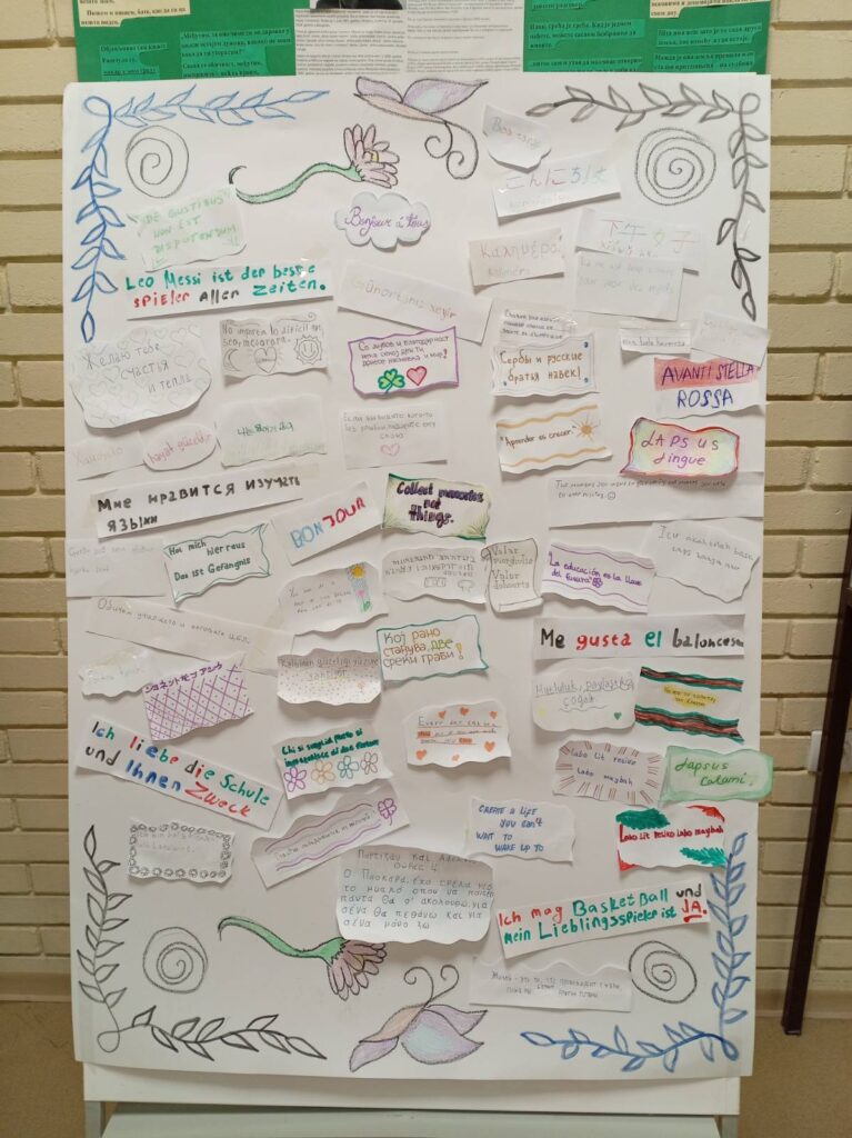 Израда паноа обезбедила је услове за дружење, размену мишљења, али и малу трибину која је имала за тему широк спектар начина учења језика путем друштвених мрежа. Подсетили смо се да су некад само припадници виших сталежа и чланови имућних породица могли себи да обезбеде широко образовање чији је саставни део био и знање више језика.