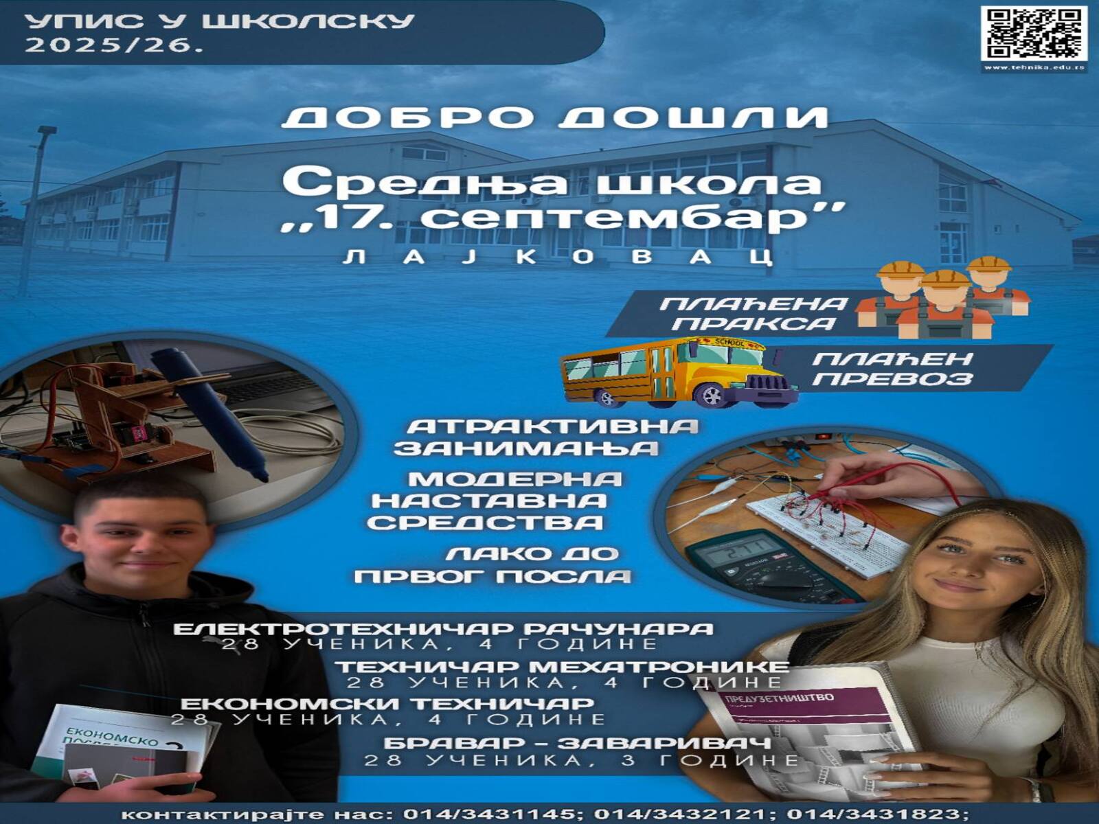 школска 2025/26. година у Средњој школи „17. септембар“ Лајковац почиње у понедељак, 01. септембра 2025. године.